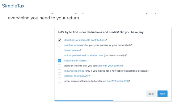 Headquartered in Vancouver, BC, SimpleTax provides a straightforward interface that’s easy to fill in and that’s approved by the CRA for online filing. A series of questions helps you to do determine what deductions might apply to your return, calculates your changes automatically, and displays the amount owing or amount of your return as you go. Fun stuff! Really!