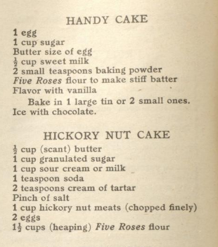 The recipes aren’t for beginners, however. Instructions for the Handy Cake includes a list of ingredients and the instructions “Bake in 1 large tin or 2 small ones. Ice with chocolate”. The Hickory Nut Cake just below that has no instructions whatsoever, just ingredients. Cookie recipes might say “roll thin and cook in a quick oven”. Temperatures and times are rarely mentioned… presumably most bakers didn’t have electric ovens, which were still quite new.